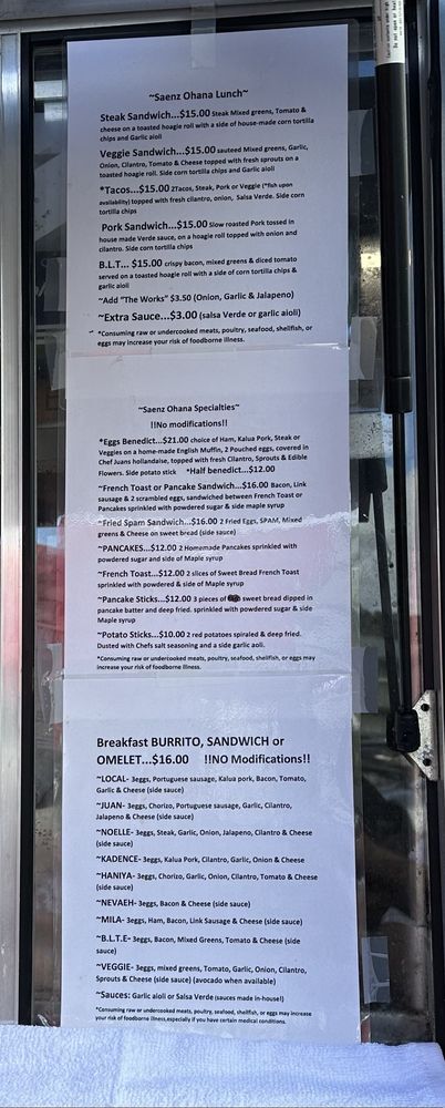 Introducing Saenz Ohana Breakfast, a delightful food wagon nestled in Princeville, Hawaii, specializing in hearty breakfast and brunch offerings. With a vibrant menu, this eatery boasts a variety of mouthwatering sandwiches, including their renowned Eggs Benedict and the indulgent French Toast Sandwich, which is perfect for those craving a filling meal. Guests rave about the Kalua Pork and Chorizo options, highlighted by the effortless fusion of flavors and local ingredients.